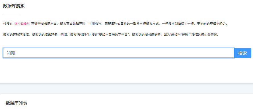 搜索以后会列出您搜索到的“知网”、“web of science”等数据库列表,列出了数据库在哪个图书馆里面。