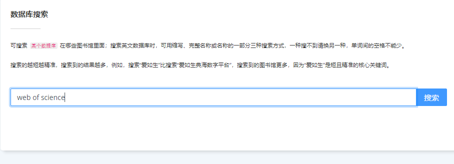 注意:英语搜索可以使用缩写(但是有的缩写搜索不到),如果使用全称例如“web of science”,单词之间的空格不能少了,缩写搜索不到或搜索很少,再使用全称,换着搜索可搜索到更多数据库。