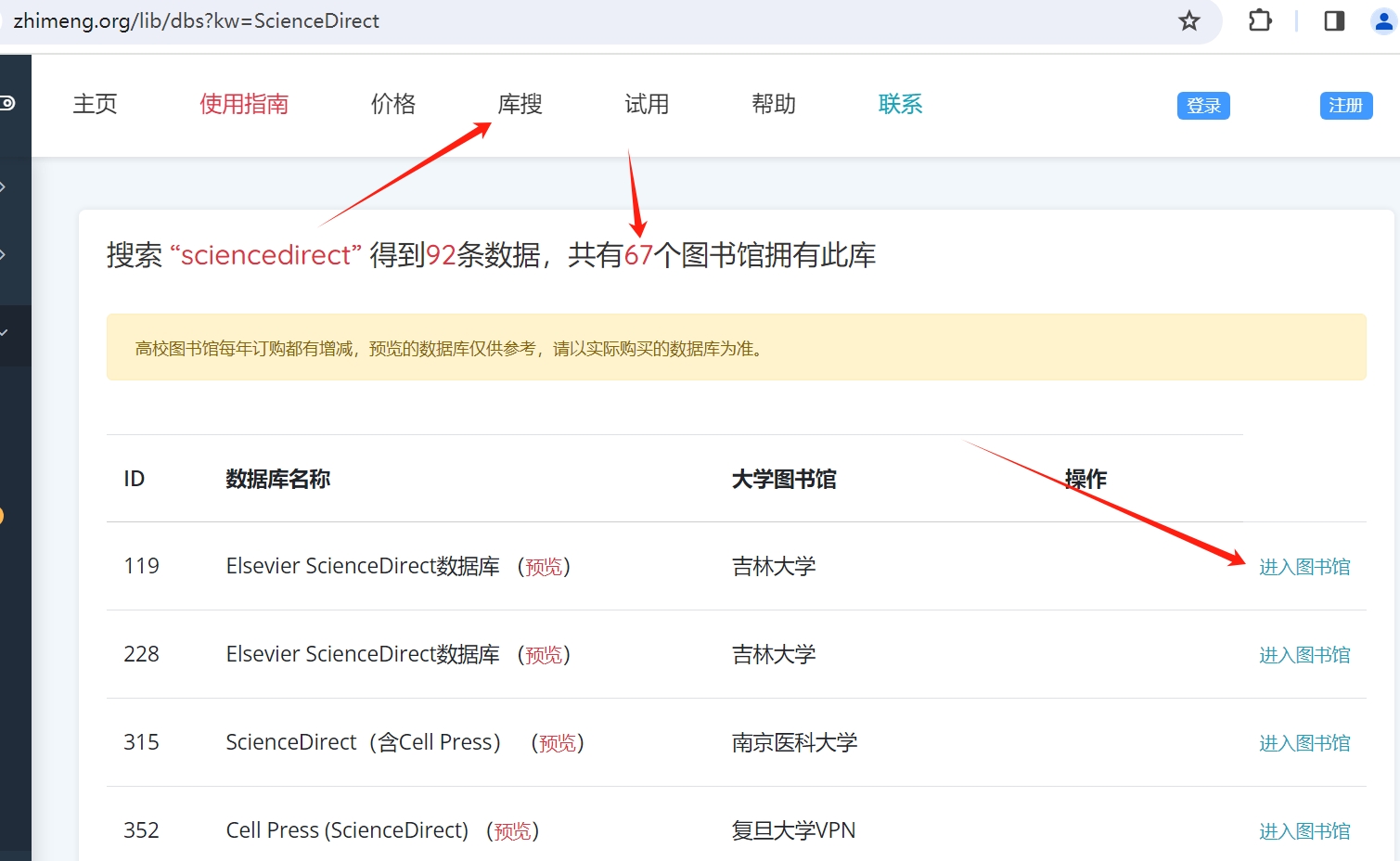 找到67个图书馆拥有“ScienceDirect”数据库,点击后面进入此图书馆即可下载相应的文献。